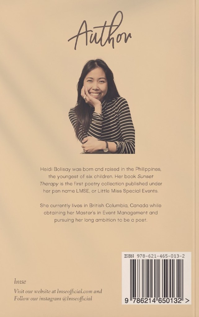 Heidi Bolisay is the poet behind Sunset Therapy, known by her pen name, LMSE. She is a writer, event planner, performer, and artist. Passionate about the things that she